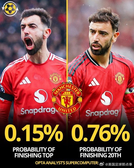 字据Opta超算展望,本赛季曼联在英超排在第20名的概率尽然比夺冠还高🤯