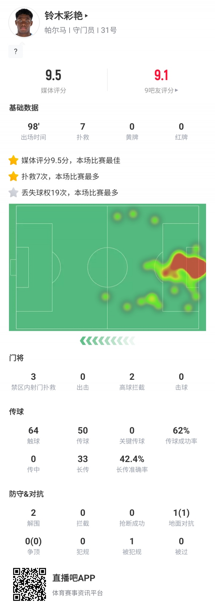 本场比赛帕尔马第42分钟便少打一东说念主,下半场补时第7分钟,热那亚压哨得到点球,铃木彩艳骁勇扑点,最终匡助球队拿下1分。