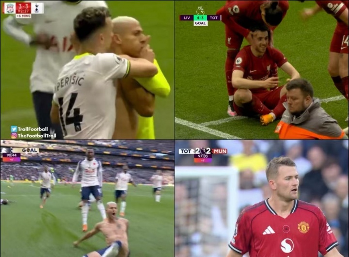 11月08日讯 英超第11轮,热刺vs曼联,比赛第91分钟,里沙利松破门+脱衣庆祝,但随后德里赫特破门扳平比分,值得一提的是,这一幕曾在2023年热刺不敌利物浦的比赛演出过。