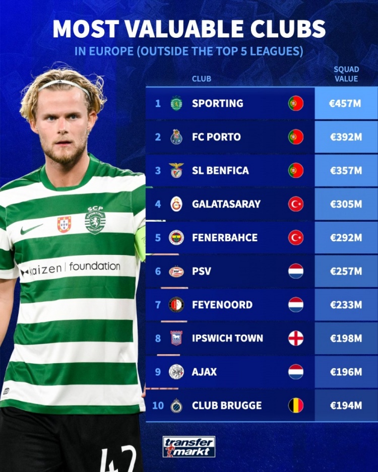 11月11日讯 德国转会阛阓统计了五大联赛以外欧洲俱乐部的身价,比肩出榜单,葡超三雄名次前三位。