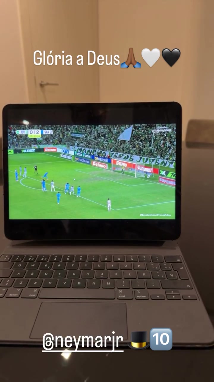 曾效率于桑托斯的罗德里戈也在关爱偶像的比赛,他在酬酢媒体上晒出通过平板电脑看内马尔戴帽的视频,配文:“荣耀归于天主。”