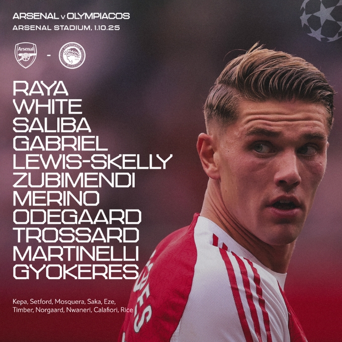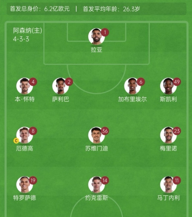 阿森纳vs奥林匹亚科斯首发:1-拉亚、2-萨利巴、4-本·怀特、6-加布里埃尔、49-斯凯利、8-厄德高、36-苏维门迪、23-梅里诺、11-马丁内利、19-特罗萨德、14-约克雷斯