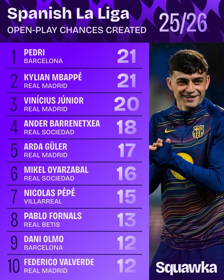 1、佩德里(巴萨):21次