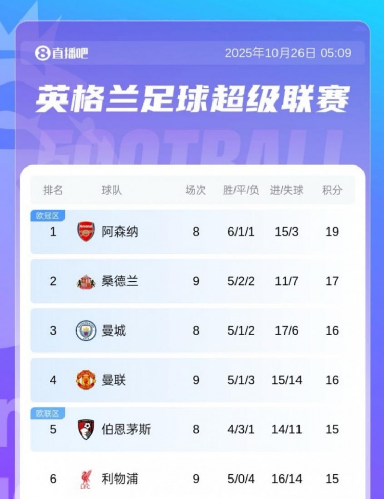 10月26日讯 2025-26赛季英超第9轮,曼联4-2校服布莱顿,升至积分榜第4,暂时和榜首的阿森纳进出3分。