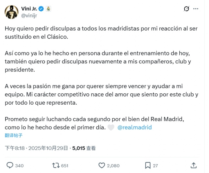 10月29日讯 维尼修斯在国度德比中,因活气被换下,直接走回更衣室。当天,维尼修斯社媒就活气被换下向皇马球迷、队友、俱乐部和主席致歉。