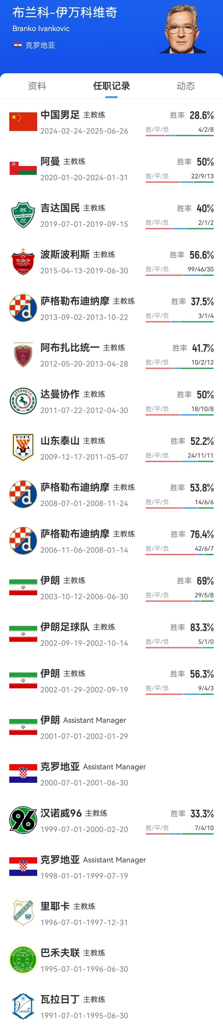 2024年2月24日,伊万出任中国男足主帅,2025年6月27日下课,手艺共带队追究比赛14场,战绩为4胜2平8负。其中叶初赛36强赛国足1胜2平1负“躺进”18强赛,18强赛国足3胜7负进7球丢20球,提前1轮无缘2026好意思加墨寰宇杯。国足也成为伊万抓教糊口的终末一站。