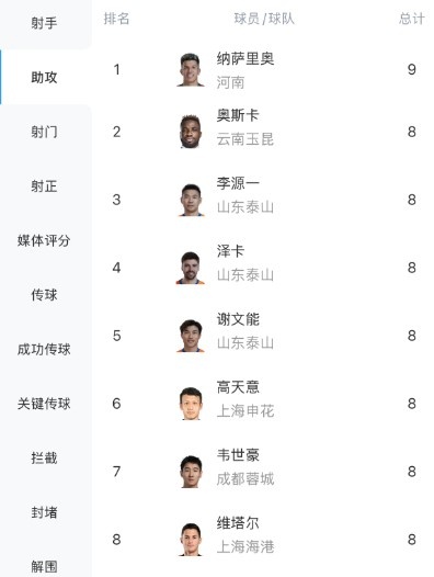 11月3日讯 中超29轮战罢,在助攻榜上,河南队外助纳萨里奥9次领跑,奥斯卡、泽卡、韦世豪等7东谈主8次。
