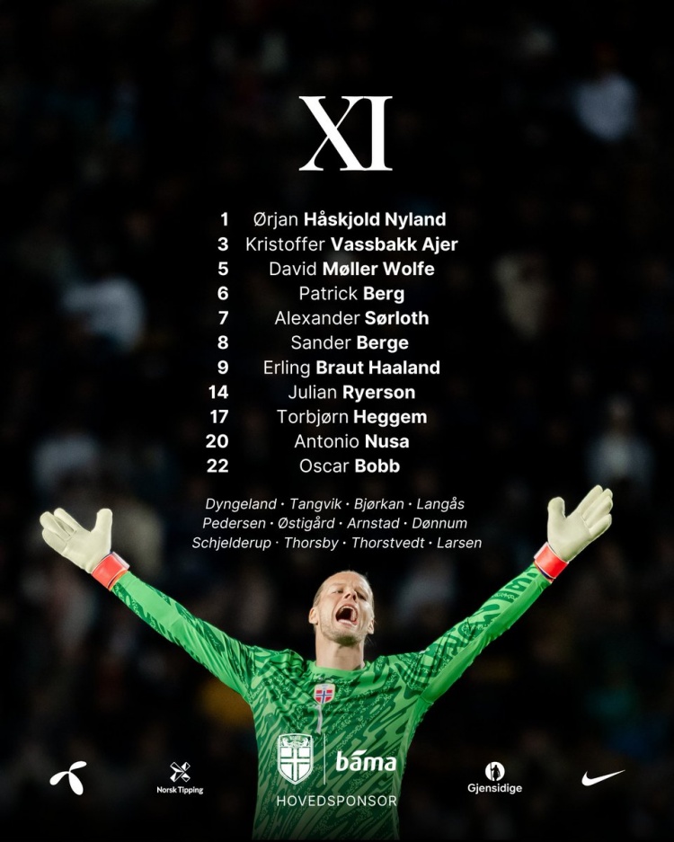 挪威首发:1-尼兰德、3-阿耶尔、5-沃尔费、6-帕特里克·伯格、7-瑟尔洛特、8-桑德·博格、9-哈兰德、14-莱尔森、17-赫格姆、20-努萨、22-奥斯卡·鲍勃