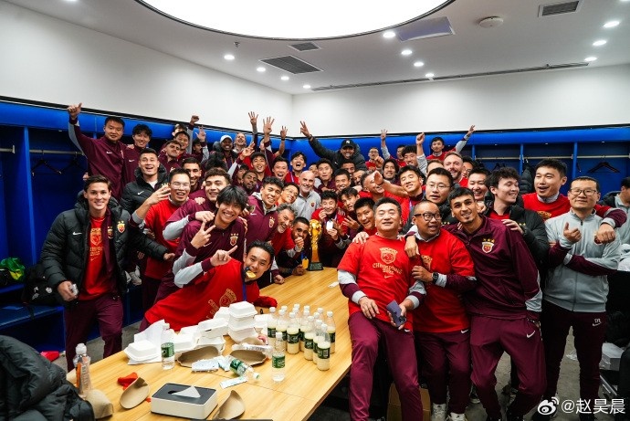 赛后,上海海港新闻官赵昊晨晒出了更衣室夺冠合影。