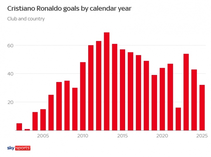 2025年,C罗依然在俱乐部和国度队攻入32球,自2010年以来,C罗平均每年进球数跨越50个,畴前15年里,他的年度总进球数只好一次低于39个。那是在2022年,那一年他攻入了16粒进球。
