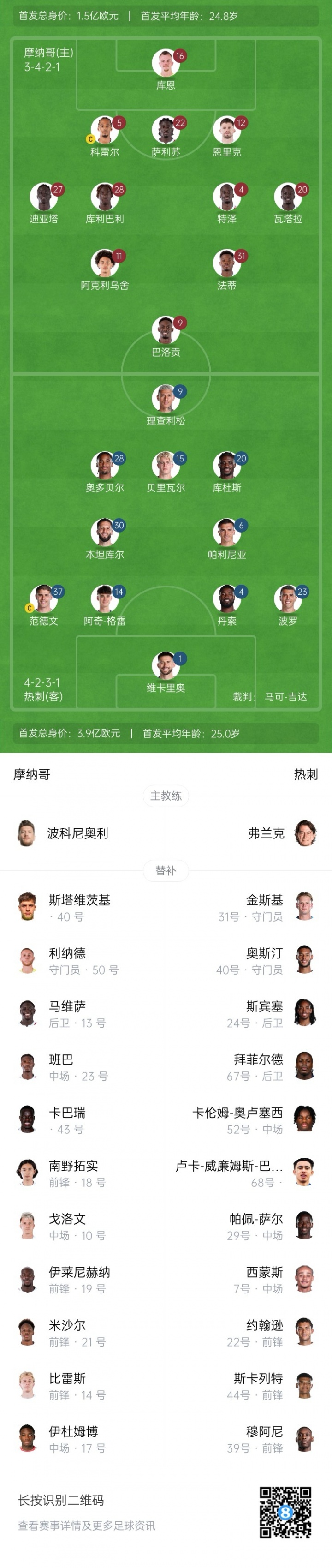 摩纳哥首发:16-库恩、5-科雷尔、22-萨利苏、12-恩里克、27-迪亚塔、4-特泽、28-库利巴利、20-瓦塔拉、31-法蒂、11-阿克利乌舍、9-巴洛贡