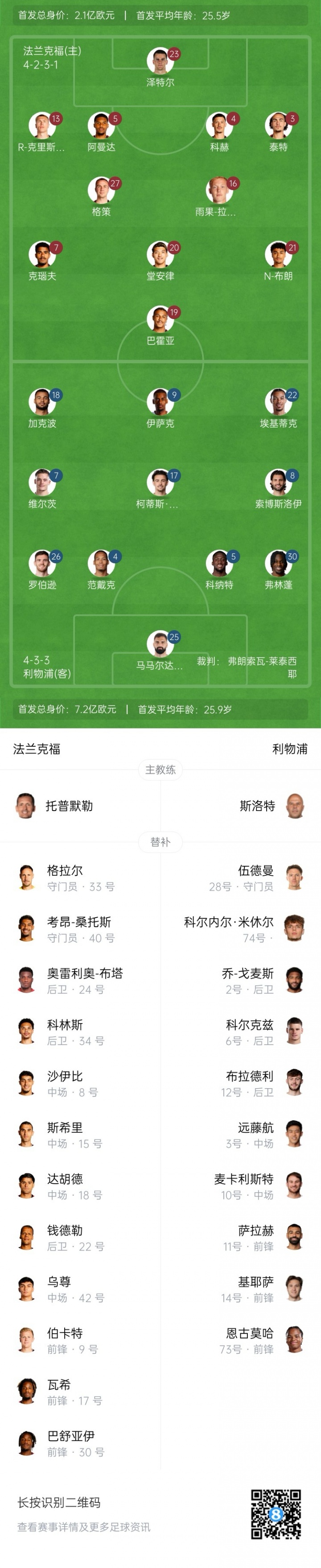 利物浦欧冠1胜1负积3分,联赛5胜3负积15分暂位英超第4,近期遭受各项赛事4连败;法兰克福欧冠相通1胜1负积3分,联赛3胜1平3负积10分暂位德甲第7,各项赛事相接3场不堪。
