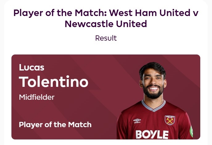 11月3日讯 英超第10轮西汉姆联主场3-1打败纽卡,据赛后英超官方音信,帕奎塔被评为此役全场最好球员,获43%的投票。