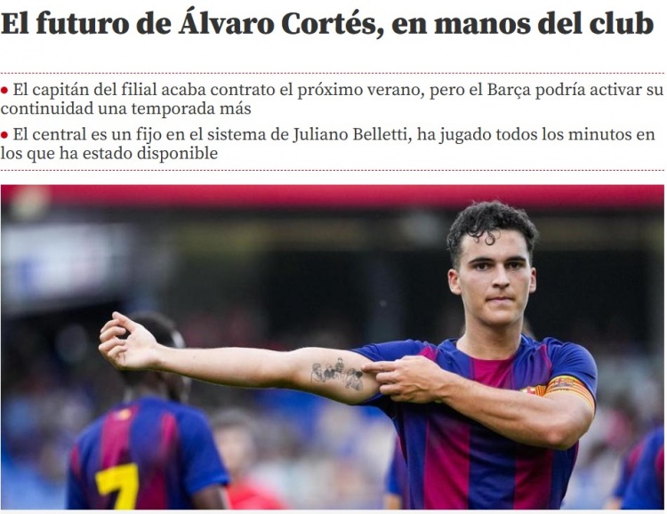 11月7日讯 《天下体育报》报谈,巴黎圣日耳曼特意巴萨B队队长阿尔瓦罗-科尔特斯,他的契约将在来岁到期。