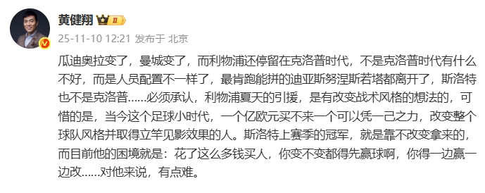 11月10日讯 英超联赛第11轮,曼城3-0利物浦。黄健翔发文谈到了利物浦。