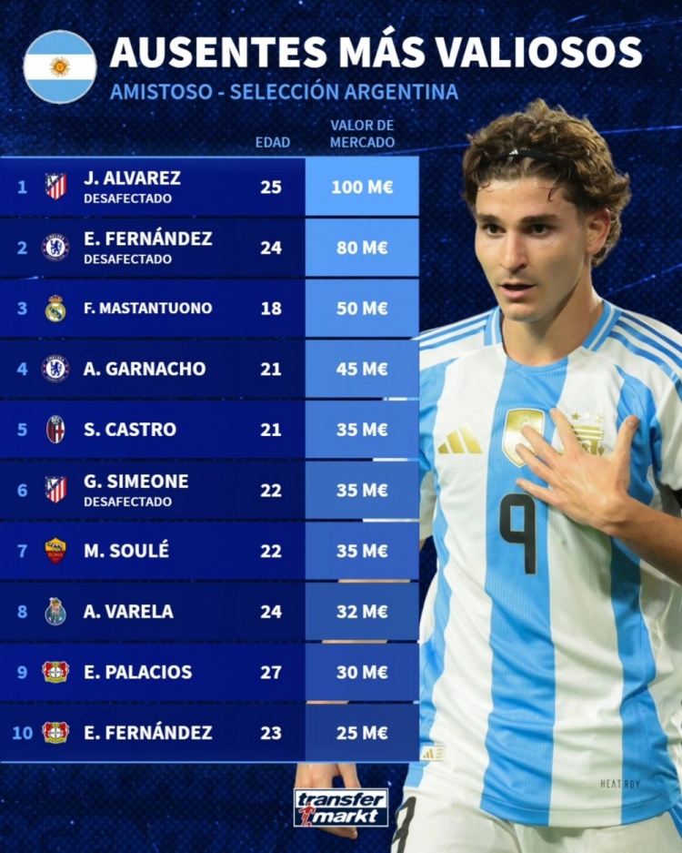 11月12日讯 德国转会市集统计了缺席本期阿根廷队球员的身价,并排出榜单,阿尔瓦雷斯1亿欧居首,恩佐-费尔南德斯8000万欧次席。