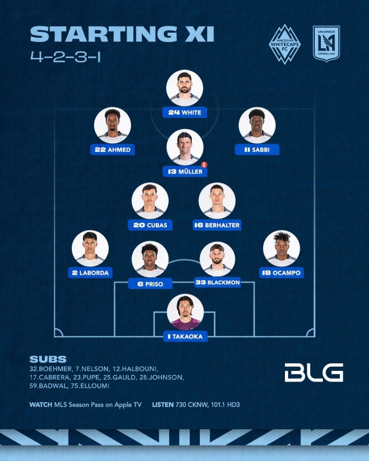 温哥华白浪首发:1-高丘阳平、2-拉沃尔达、6-普里索、33-布莱克蒙、18-奥坎波、20-库巴斯、16-伯哈尔特、22-艾哈迈德、13-穆勒、11-萨比、24-布莱恩·怀特