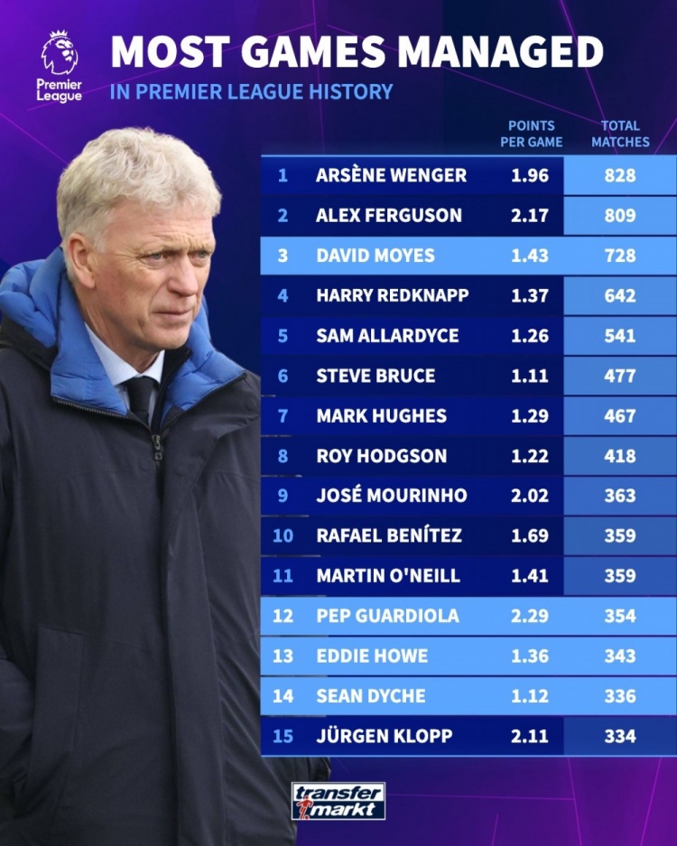 11月26日讯 德国转会市集统计了英超主帅抓教场次名次,莫耶斯728场名按序三,有望追逐弗格森和温格。