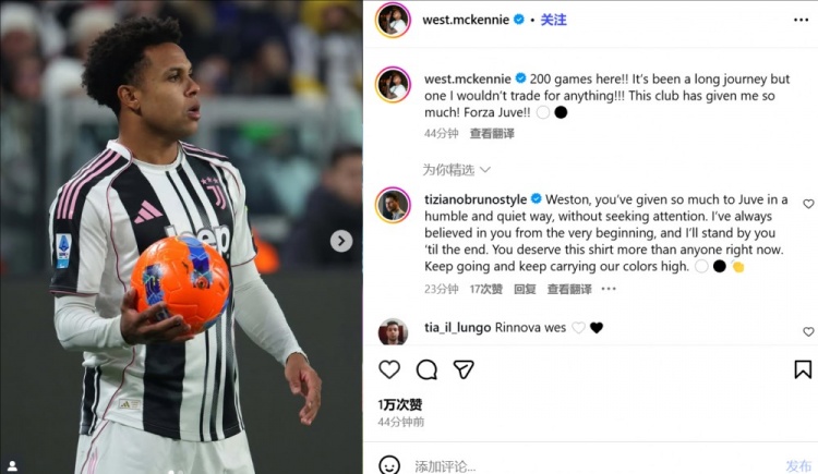 12月3日讯 在尤文2-0打败乌迪内斯后,完成尤文糊口第200场里程碑的麦肯尼更新了外交媒体。