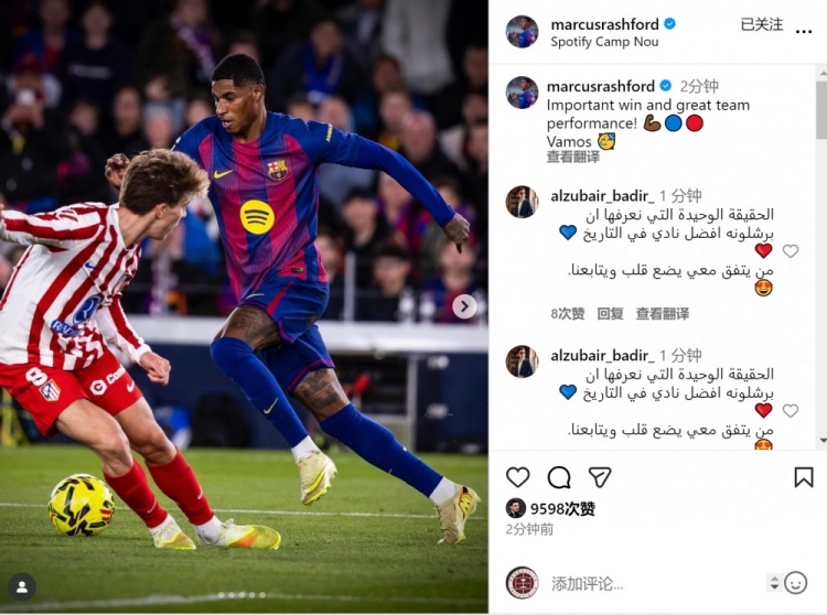 拉什福德社媒晒出比赛相片,并写谈:“病笃的得胜,出色的团队弘扬。加油!”