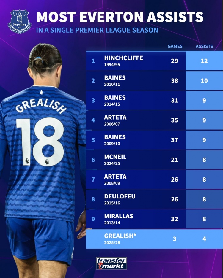 9月12日讯 英格兰中场格拉利什今夏转会埃弗顿,再行找回了气象。凭借新赛季三次出场就孝顺的四次助攻,格拉利什有望突破埃弗顿单赛季英超联赛中的助攻记载,该记载由安迪-辛奇克利夫保抓。