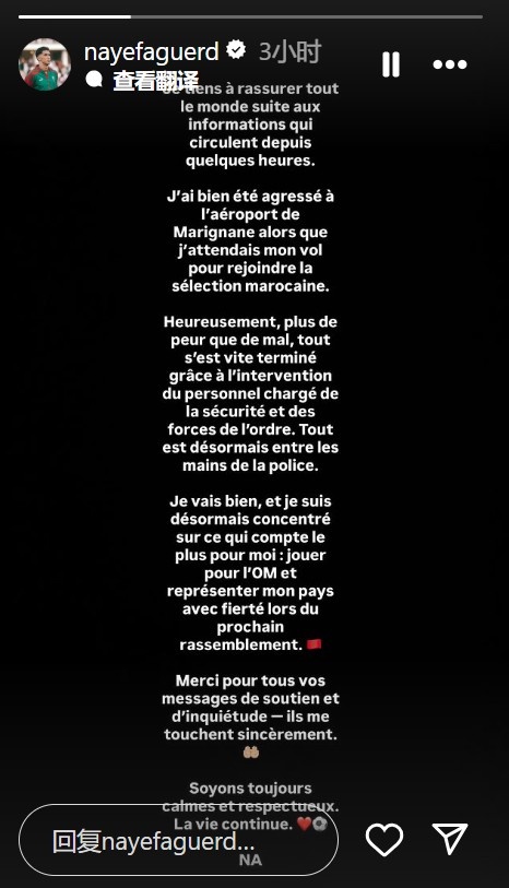 “庆幸的是,惊吓大于伤害,事件在安保东说念主员和国法部门的实时介入下赶快平息。咫尺一切已交由警方照应。我咫尺很好,也已将留心力重新放在最重大的事情上:为马赛遵守,并在行将到来的国度队集训中自重地代表故国出战。”
