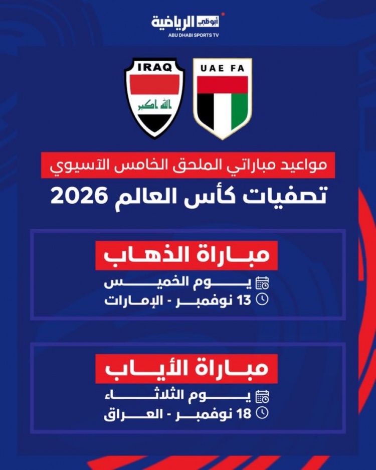 世初赛亚洲区第五阶段,将由阿联酋与伊拉克进行主客两回合较量,胜者将获取洲际附加赛阅历。