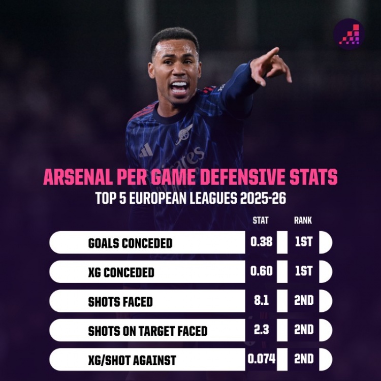 数据统计浮现,阿森纳本赛季5项注重端要害数据均位列英超前二: