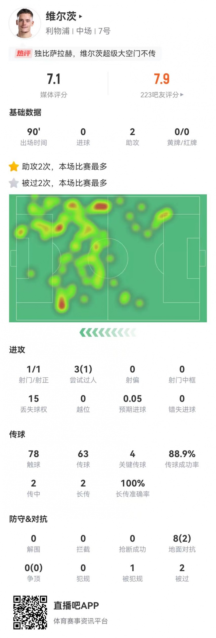 10月23日讯 利物浦在本轮欧冠客场5-1逆转法兰克福,维尔茨本场数据如下: