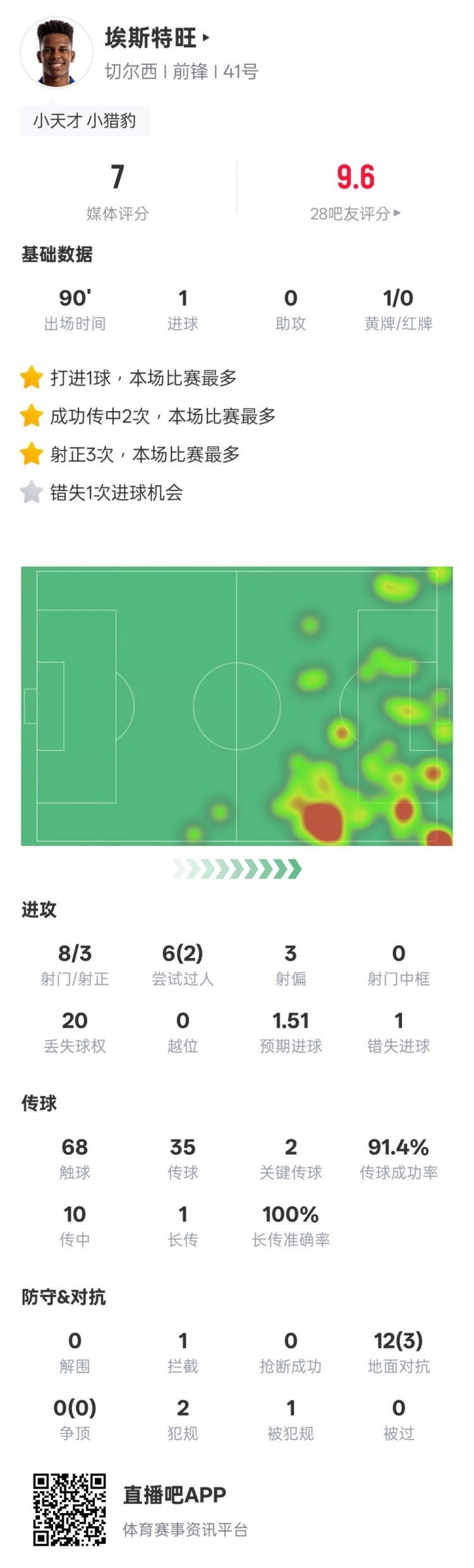 10月23日讯 欧冠联赛阶段第3轮,切尔西5-1大捷阿贾克斯。埃斯特旺首发出战,孝顺1粒进球,送出2次要津传球,但也错失1次进球契机,评分7.0。