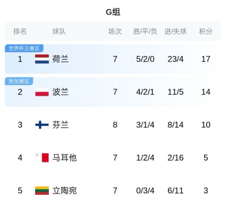 G组荷兰本轮未能打败波兰,荷兰17分,波兰14分,荷兰手持13个净胜球上风。末轮荷兰对阵立陶宛,波兰对阵马耳他。