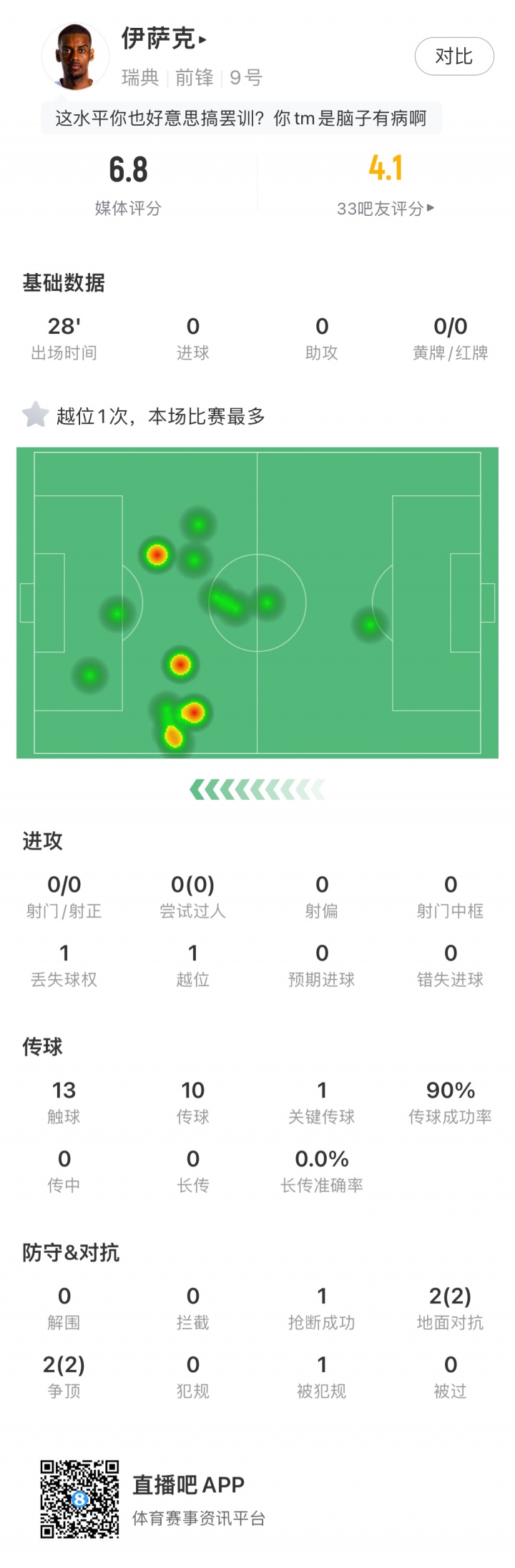 伊萨克是瑞典阵中身价最高(1.4亿欧)的球员,但本届世初赛于今他仍未得到进球。本场他替补登场半小时,未能匡助球队扭转场地。