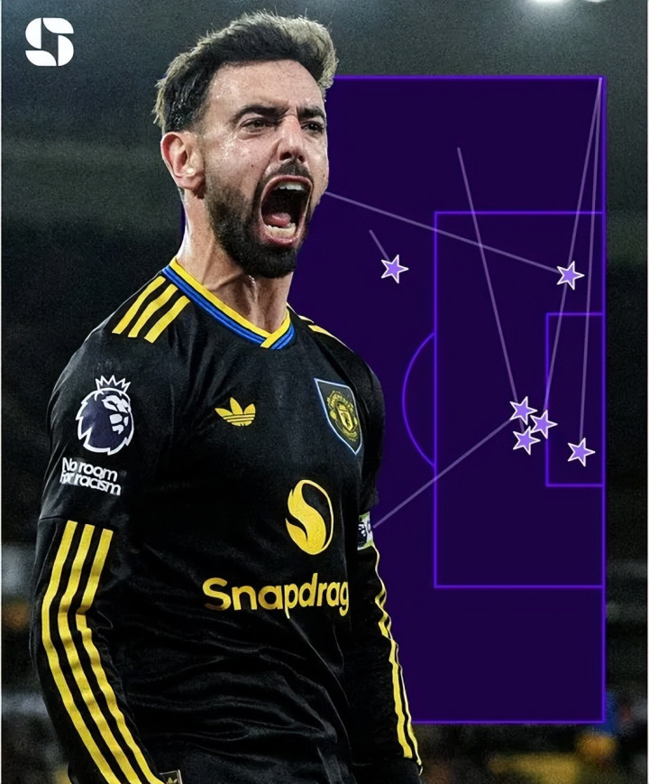 这场比赛的弥散主角,是队长 B 费!31 岁的葡萄牙中场透顶打疯了,全场 2 射 1 传独造 3 球,攻防两头齐很出色。第 25 分钟,曼联前场断球后快速反击,库尼亚在禁区左侧送出精确横传,B 费实时赶到铲射破门,匡助球队 1比0 结巴僵局,这脚响应速率太绝了!