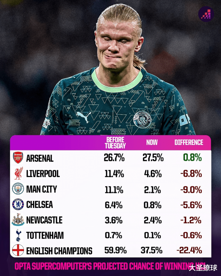 曼城是最大“输家”,夺冠概率暴跌9个百分点,仅剩2.1%。利物浦(-6.8%)和切尔西(-5.6%)的夺冠希望也大幅缩水。纽卡(-1.2%)和热刺(-0.6%)原本机会就微乎其微,下周要面对西甲强敌,前景更加渺茫。
