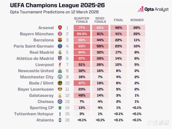 阿森纳贡献了其中绝大多数可能,在超过四分之一的模拟结果中夺冠(26.7%);利物浦(11.4%)和曼城(11.1%)也被视作有力竞争者;切尔西(6.4%)和纽卡(3.6%)拥有不错机会,热刺(0.7%)则是冷门候选。总体来看,英超队伍本比联赛季夺冠概率高达59.9%。