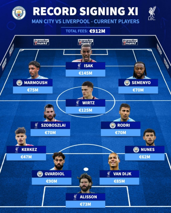 德国转会市场发文,盘点了利物浦和曼城的现役最贵签约阵形 。