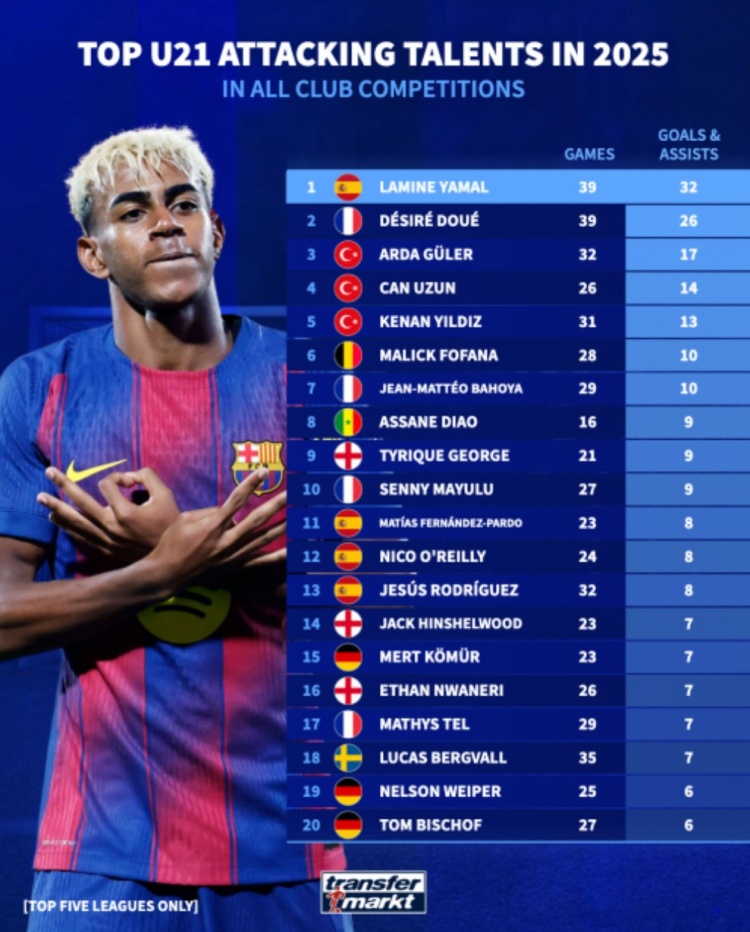 10月10日讯 德国转会阛阓清点了2025年俱乐部层面各项赛事参与进球最多U21球员,亚马尔39场32球居首,杜埃39场26球位居次席。