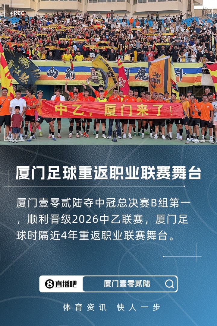 中冠决赛阶段分组赛B组,厦门壹零贰陆7轮5胜2平夺得B组第一,取得投入2026中乙联赛的经验,厦门足球时隔近4年重返办事联赛舞台!