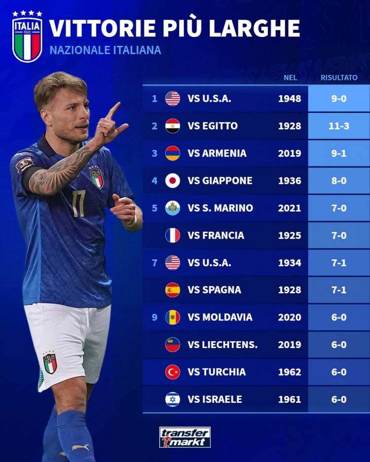 11月14日讯 北京技术11月17日凌晨,意大利将谢世初赛终末一轮比赛中主场对阵挪威,意大利此役需要至少净胜挪威9球,能力径直出线。德国转会商场列出了意大利队史最大比分到手榜单。