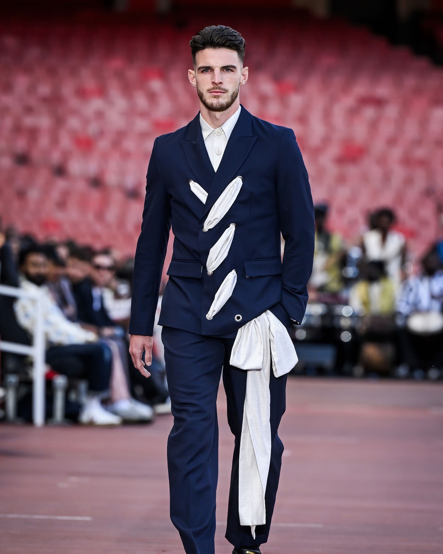 客岁9月,赖斯初次登上T台,为Labrum2025春夏系列男装走秀。这是一场场以阿森纳足球俱乐部为主题的时装秀,在酋长球场举行,赖斯身着一件修身丝带庇荫西装,搭配阿迪达斯Superstar畅通鞋登台。