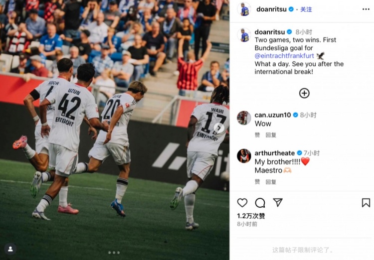 赛后堂安律社媒晒出和队友庆祝照,并配文写谈:“两战两胜,况且我成绩了法兰克福生计的德甲首球,何等机要的一天!外洋比赛日后重逢!”
